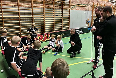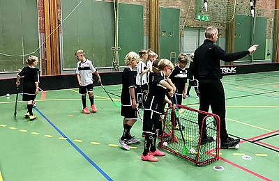 Vi gick sedan över på en ny övning. Vi ställde upp i två led till höger om ena målet. Ledet till vänster var försvarare och ledet till höger var anfallare. Vi slog en boll upp till vänstra hörnet och första spelaren i varje led jagade efter bollen. Anfallaren skulle försöka slå in bollen framför mål till en medspelare som skulle slå bollen i mål. Försvararen skulle försöka slå upp bollen utmed långsidan till en medspelare där. När kampen om bollen var över skulle anfallaren ta plats framför mål och försvararen ta plats utmed långsidan. Efter en stund så spegelvände vi övningen för att både höger och vänster skyttar skylla få jobba med både backhand och forehand. Syftet med övningen är att öva på en matchlik situation för att nöta in detta beteendet. Det gick lite trögt i början och det var lite förvirrat var man skulle ta vägen i platsbyten på plan. Men ju mer vi körde ju bättre blev det. Vi kommer att jobba vidare med detta.