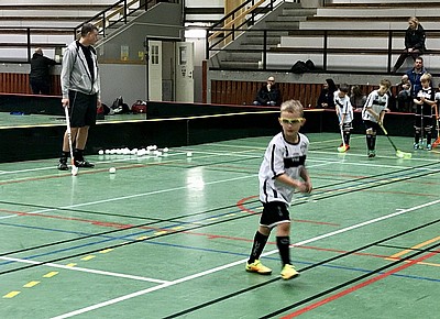 Nu var alla rejält uppvärmda. Vi gick nu över till treskottsövningen. Killarna ställer upp på ett led och första spelaren springer upp i banan och tar ett avslut på mål. Han får sedan en passning från vänster hörn och tar avslut. Spelaren backar sedan upp i slottet och får en passning från höger hörn och tar avslut igen. Syftet med denna övningen är att snabbt kunna skjuta om och om igen och hitta målet. Killarna blev bättre och bättre på att hitta rätt. Vi spegelvände sedan övningen så att höger och vänster skyttar fick samma förutsättningar. Det blev först lite förvirrat men sedan blev det bättre igen.