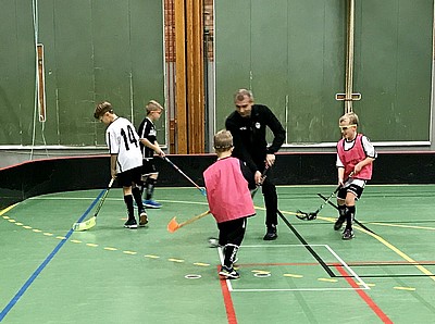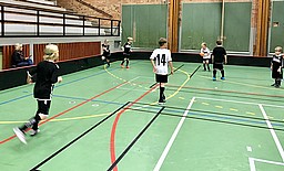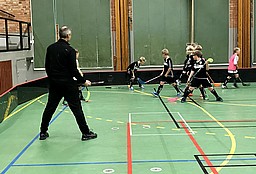 Nu var det dags för en ny övning. Vi ställde upp i ett led i ena hörnet. Första man i ledet springer från hörnet upp i slottet och vänder sig om. Då passar nästa man i kön bollen upp till spelaren i slottet som tar ett avslut på mål och går sedan till andra hörnet vid sidan om målet. Sedan springer den som nu är först i ledet upp till slottet och vänder sig om och får en passning från nästa i ledet och tar avslut osv. Det gick lite knackigt i början men allteftersom killarna förstod att det var viktigt att vara beredd i ledet så blev det bättre. När vi hade kört från båda hållen ett par gånger så var det dags för drickapaus men killarna ville köra mera för att det var roligt. Syftet med övningen är att man ska förstå att det gäller att hitta sin position framför målet och stå rättvänd med två händer på klubban och vara beredd att ta avslut. Detta funkade bra! Sedan tvingar denna övningen även att killarna måste vara koncentrerade hela tiden även när man står i ledet och väntar på sin tur. Nyttigt helt enkelt.