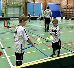 Sedan gick vi över till att öva på teknik genom bollkontroll. Killarna gick ihop 2 och 2. De la upp bollen på bladet på klubban ställde sig mitt emot varandra. De skulle nu röra bollen i cirklar runt sin kompis boll som gjorde samma sak. Detta utan att tappa bollen från bladet. En klurig övning. Vi gick sedan över till att de skulle röra sig på planen med bollen ligga dessa på bladet utan att tappa den. Vi ökade nu på svårigheten. Nu skulle killarna kasta upp bollen från klubban upp i luften och fånga den på bladet igen. Inte det lättaste men efter en stund så fick killarna bättre koll på det. Vi avslutade med att de skulle passa bollen i luften till varandra och försöka att fånga den på bladet. Syftet med dessa övningarna är att killarna ska få känsla i hur de ska hantera bollen. Detta kan man öva på hemma om man vill bli bättre.