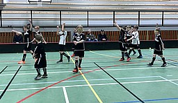 Vi fortsatte med stafettövningen där vi slår upp en boll mot mitten och två spelare kämpar om bollen för att göra mål på andra sidan. En favorit bland killarna. Idag så blev de utmanade och Thore och Petter som körde några rundor.