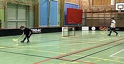 Vi körde sedan stafetten som vi har gjort tidigare. Killarna ställde upp i två led. Första man i varje led springer upp i banan och rundar en klubba först med forehand springer sedan vidare upp till sargen och passar sig själv. Därefter lägger man ner klubban på golvet och gör tre upphopp. Sedan plockar man upp klubban och springer tillbaka och rundar klubban på golvet fast i en backhand cirkel istället. När man är klar så passar man första man i ledet. Så fortsatte vi till alla hade gjort två gånger.