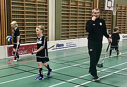 Därefter så körde vi en ny övning där vi ställde upp i ett led en bit till vänster från mitten. Vi sprang sedan fram med vill till en kona en bit upp mot målet. Där vek spelarna av in mot mål och tog skott med antingen forehand eller backhand beroende på om man är höger eller vänsterskytt. Efter att man. Tagit skott så sprang spelaren upp till mitten igen fast på höger sida om mitten. När alla hade skjutit så gjorde vi om samma sak fast från höger istället så att alla fick öva på att skjuta både forehand och backhand. Vi gjorde samma sak på båda planhalvorna så att vi höll igång samtliga spelare i ett högt tempo.