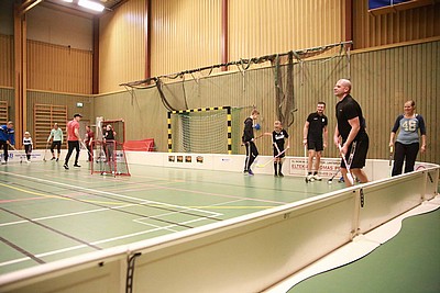 Vi började med en samling och därefter en uppvärmning. Bonny tog tag i föräldrarna. Här var det extra viktigt för att de inte skulle dra på sig några skador inför julen. Thore och Petter körde igång uppvärmningen för spelarna. Daniel och Henrik satte ihop laget.