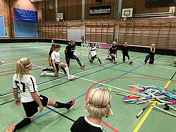 Idag så var det Lisa som tog tag i uppvärmningen. Det var flera nya spännande övningar. Bland annat så fick tjejerna jobba lite tillsammans två och två. Den som var först skulle springa med höga knä samtidigt som den andra spelare skulle stå bakom och bromsa genom att hålla i sidorna på tjejer framför. Här blev det många goa skratt. Tjejerna fick öva på att stretcha vilket var nytt för många av dem. Lisa gick igenom hela kroppen från fötter till huvud.
