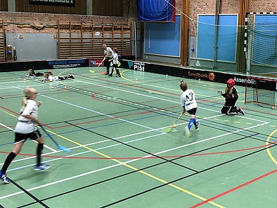 Sedan så var det dags för tjejerna att få jobba lite extra. Vi delade upp oss på hälften på varje sida. De ställde sedan upp i två led på var planhalva. Första två lägger sig på golvet med klubban framför sig och sedan så passar en tränare bollen mellan tjejerna och då gäller det att resa sig upp så snabbt som möjligt och försöka komma först till bollen och försöka göra mål på målvakten på andra sidan. Här var det många goda kamper om bollen!