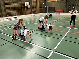 Vi körde vidare med en skottövning där de kom med fart och sköt på mål. Efter en stund fick de två grupperna tävla om vilka som kom först till fem mål. Då taggade de till och det var roligt att se hur de jublade åt varandra.