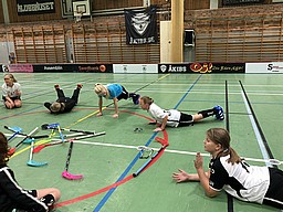 Sedan så var det dags för tjejerna att få jobba lite extra. Vi delade upp oss på hälften på varje sida. De ställde sedan upp i två led på var planhalva. Första två lägger sig på golvet med klubban framför sig och sedan så passar en tränare bollen mellan tjejerna och då gäller det att resa sig upp så snabbt som möjligt och försöka komma först till bollen och försöka göra mål på målvakten på andra sidan. Här var det många goda kamper om bollen!